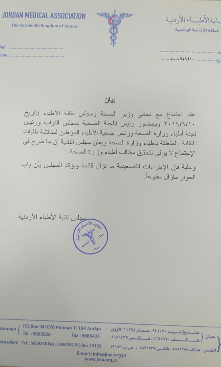نقابة الاطباء: الاجراءات التصعيدية قائمة10-09-2019 04:08 PM