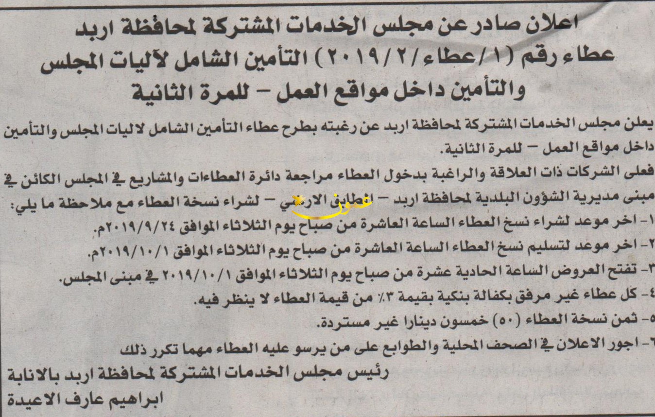 مطلوب التأمين على آليات مجلس الخدمات المشتركة لمحافظة اربد