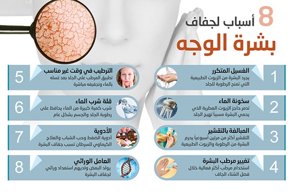 الإفراط في غسيل وتعقيم بشرة الوجه من أهم أسباب جفافها، حيث يحتوي الجلد على زيوت طبيعية، وعند غسل الوجه باستخدام الصابون أو منظف البشرة عدة مرات في اليوم، فهذا يجرد الجلد من الرطوبة.