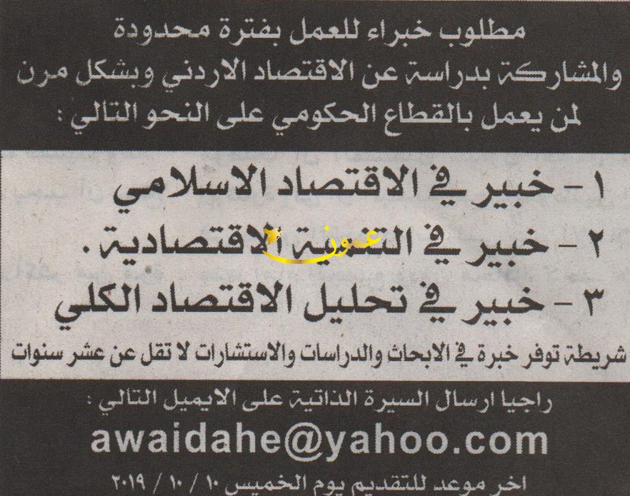 مطلوب خبراء للعمل بفترة محدودة