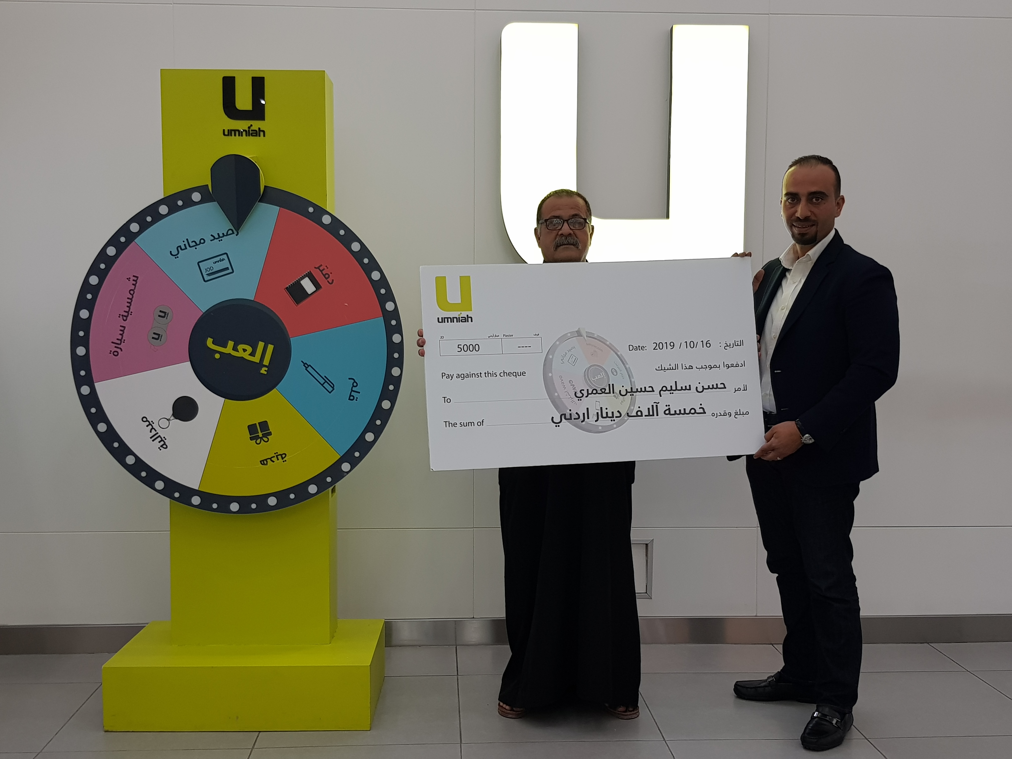 وسلّم رئيس قسم تسويق المنتجات في شركة أمنية خلدون سويدان، السيد حسن سليم حسين العمري الجائزة الكبرى وقيمتها 5000 دينار، وذلك خلال حفل أقيم في مقر الشركة الرئيسي وبحضور عدد من كبار الموظفين.