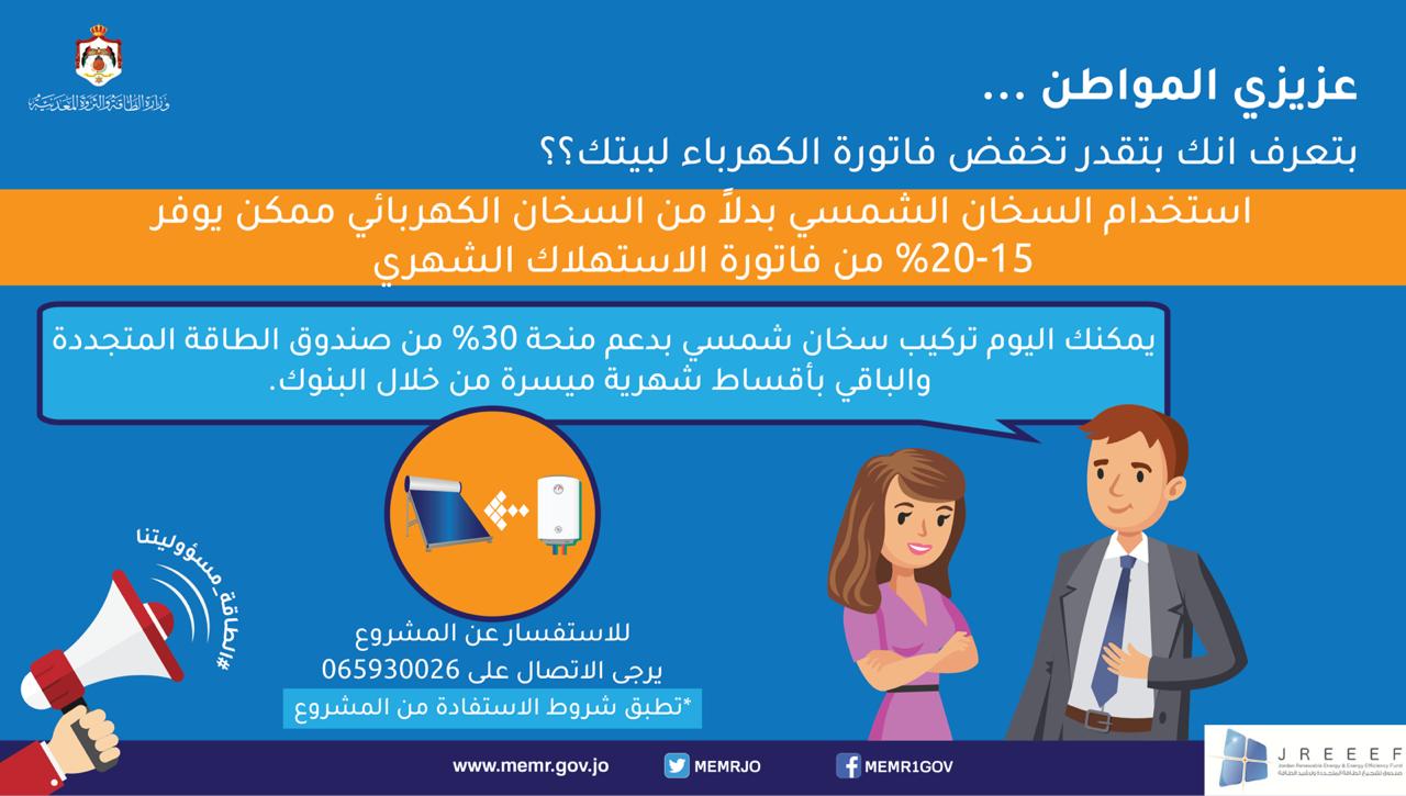 عمون - أعلن صندوق الطاقة المتجددة وترشيد الطاقة/ وزارة الطاقة اليوم الاحد عن فتح المجال للمواطنين الراغبين بالاستفادة من برنامج تركيب انظمة خلايا شمسية وسخانات شمسية مدعومة بنسبة 30%.