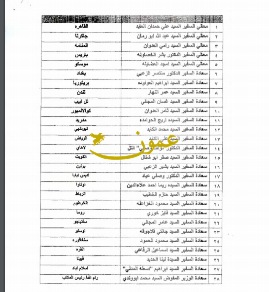 عمون- محمد الصالح- كشف وزير الخارجية وشؤون المغتربين ايمن الصفدي عن أسماء السفراء الأردنيين والموظفين الدبلوماسيين من رتبة ملحق المنقولين للبعثات الدبلوماسية خلال عامي 2017 و2018. |