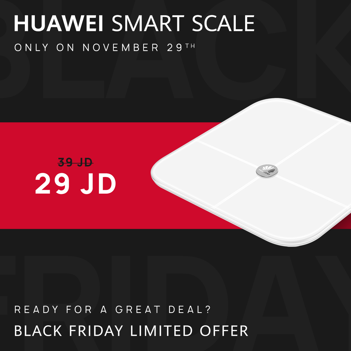 ومن عروض الجمعة السوداء أيضاً، ميزان هواوي الذكي للجسم Huawei Smart Scale، والذي يوفر لك مؤشرات حول صحتك ومستوى لياقتك البدنية، ويتيح أمامك فرصة متابعة أهدافك الصحية وتحقيقها خطوة بخطوة. ويقدم الميزان قراءات دقيقة وفهم شامل للظروف البدنية، من خلال مؤشرات كتلة الجسم BMI، ومعدل الأيض الأساسي BMR، ونسبة الدهون، ووزن الجسم، وكتلة العضلات. ويمكنك اقتناء هذا الميزان المميز خلال الجمعة السوداء بسعر 29 ديناراً بدلاً من سعره الأصلي 39 ديناراً، وذلك حتى يوم 29 تشرين الثاني 2019 فقط.