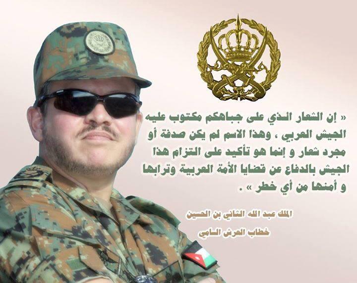 عندما قال الملك عبدالله الثاني بن الحسين (حفظة الله ) في خطاب العرش السامي الثاني لمجلس الامة السابع عشر في شهر نوفمبر/ تشرين الثاني 2014 “أقول للنشامى في الجيش العربي: ان الشعار الذي على جباهكم مكتوب عليه (الجيش العربي) وهذا الاسم لم يكن صدفة او مجرد شعار " وانما هو تأكيد على التزام "هذا الجيش بالدفاع عن قضايا الأمة العربية وترابها وأمنها من أي خطر يهددها". في ذلك الخطاب لم يكن حديث جلالة الملك أيضا صدفة ولم يكن شعار بل كان يعني الكثير.