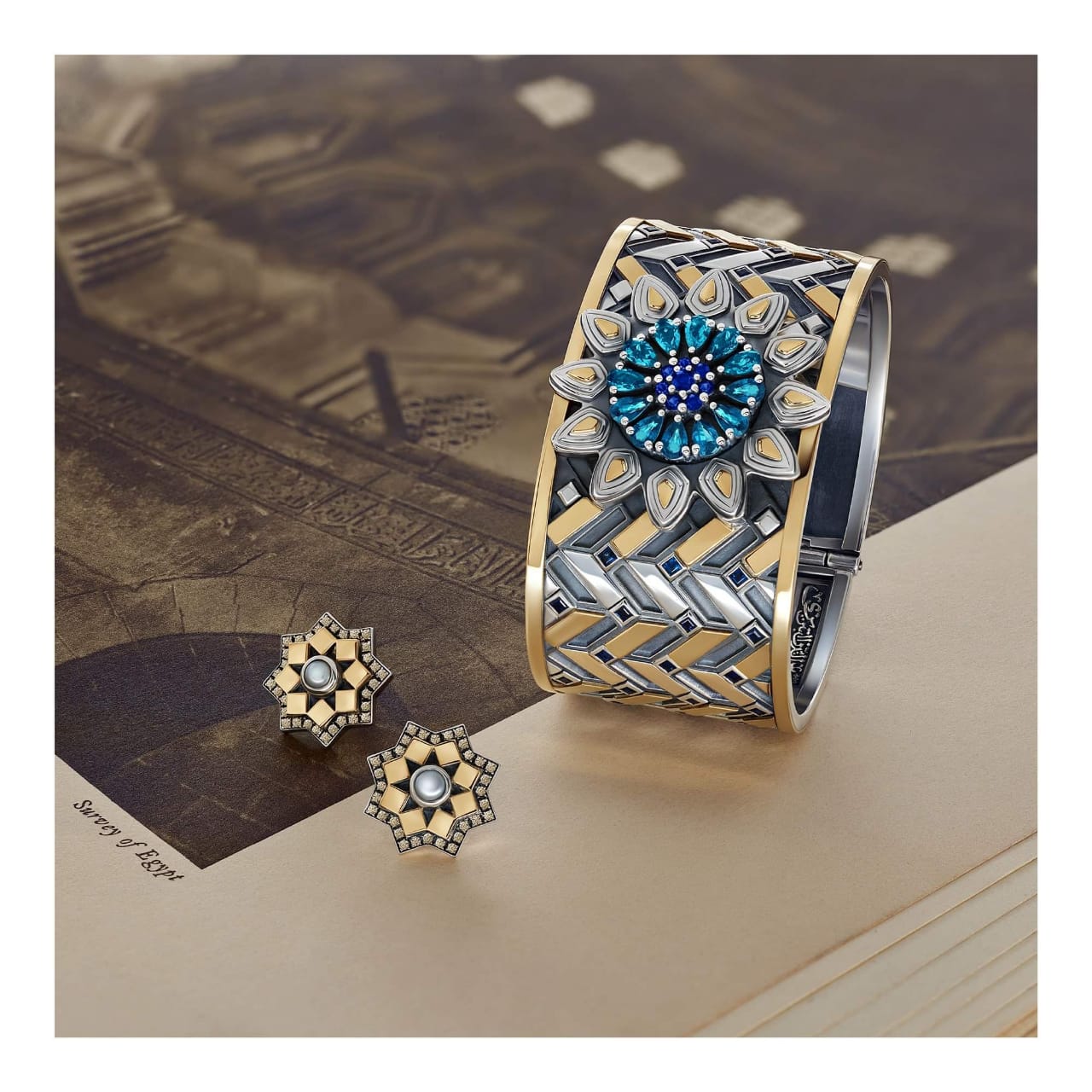زكذلك عقد "السلطان حسن" مستوحى من تفاصيل الرصيف الرخامى الملون لفناء المدرسة وعقد "المماليك" كما ضمت المجموعة الجديدة مجموعة متفردة من تصاميم الخواتم وطرائق معالجتها لتبدو في الأصابع كنجمات لامعة تاخذ العين، منها خاتم "المئذنة " واسمه مستوحى من لقب القاهرة " بلد الالف مئذنة " خاصة مئذنة مدرسة الصالح نجم الدين ايوب وخاتم "السلطانة" تخليدا للسلطانة شجرة الدر صاحبة القرار الجرئ بانشاء اول قبة فى المدينة بداخل مجمع اضرحة السلطان ايوب زوجها السابق بقلب القاهرة .خاتم على شكل قبة لحجر 28ق من الجمشت والتوباز الليمونى وخاتم "قلاوون" المزين بنقوش هندسية تشبه تلك الموجودة على لوحة فسيفساء ضريح السلطان المنصور قلاوون