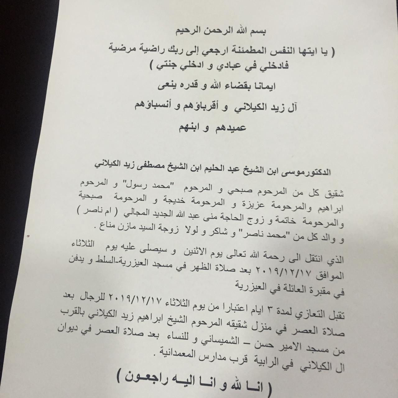 وتقبل التعازي للرجال في منزل المرحوم الشيخ الدكتور ابراهيم زيد الكيلاني في الشميساني بجوار مسجد الامير حسن بعد صلاة العصر ولمدة ثلاثة ايام ،وللنساء في ديوان الكيلاني – الرابية .