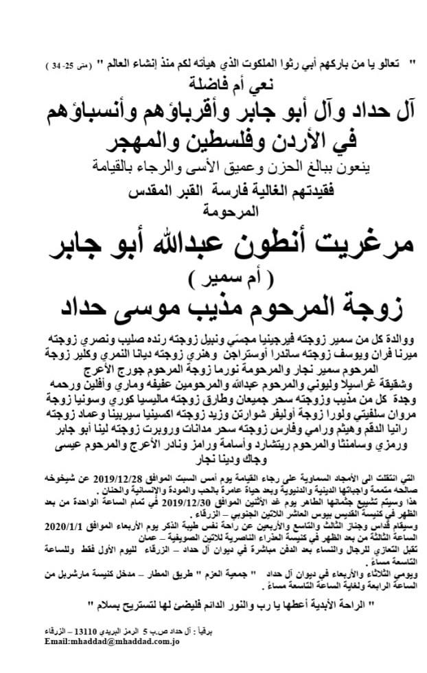عمون - ينعى آل حداد وآل أبو جابر وأقرباؤهم وأنسباؤهم في الأردن وفلسطين والمهجر ببالغ الحزن والأسى فقيدتهم الغالية مرغريت أنطون عبدالله أبو جابر (أم سمير) زوجة المرحوم مذيب موسى حداد، والتي وافتها المنية السبت.