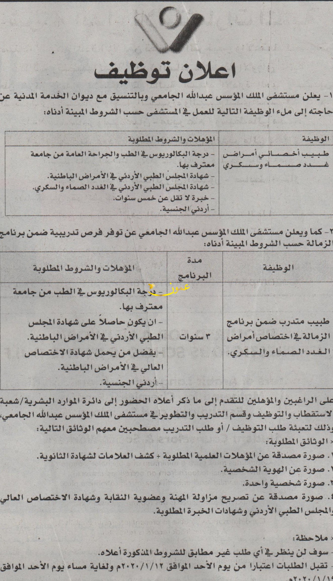 وظائف شاغرة لدى مستشفى الملك المؤسس عبدالله الجامعي