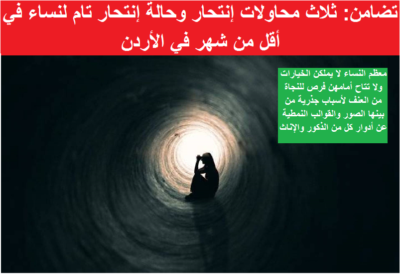 عمون - خلال أقل من شهر، رصدت جمعية معهد تضامن النساء الأردني "تضامن" حدوث ثلاث محاولات إنتحار وحالة إنتحار تام بين الفتيات والنساء في الأردن، حيث تم ثني إمرأة عن الإنتحار، وإصابة إمرأتين إصابات بالغة بعد إقدامهن على الإنتحار، ووفاة إمرأة رابعة إنتحاراُ.