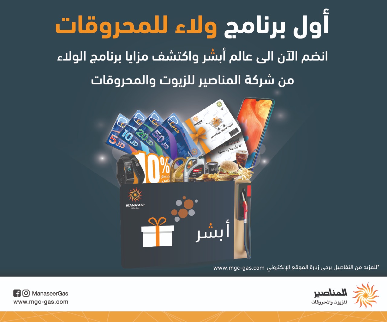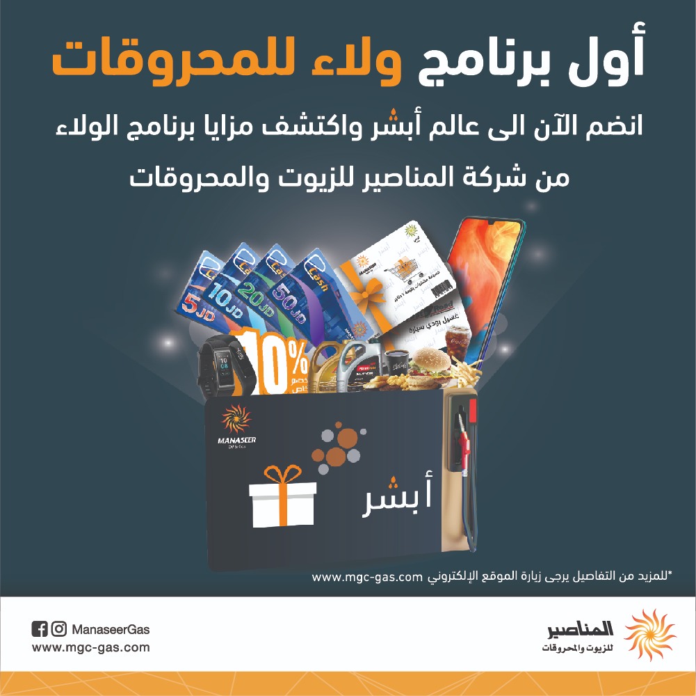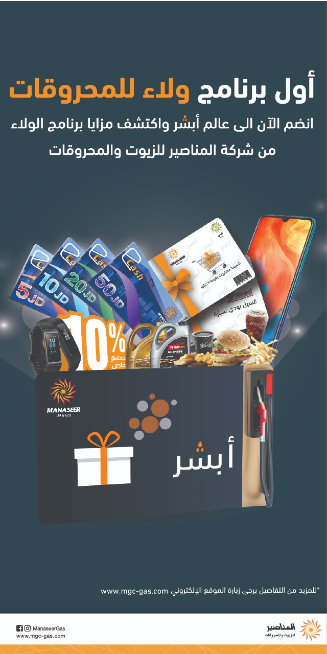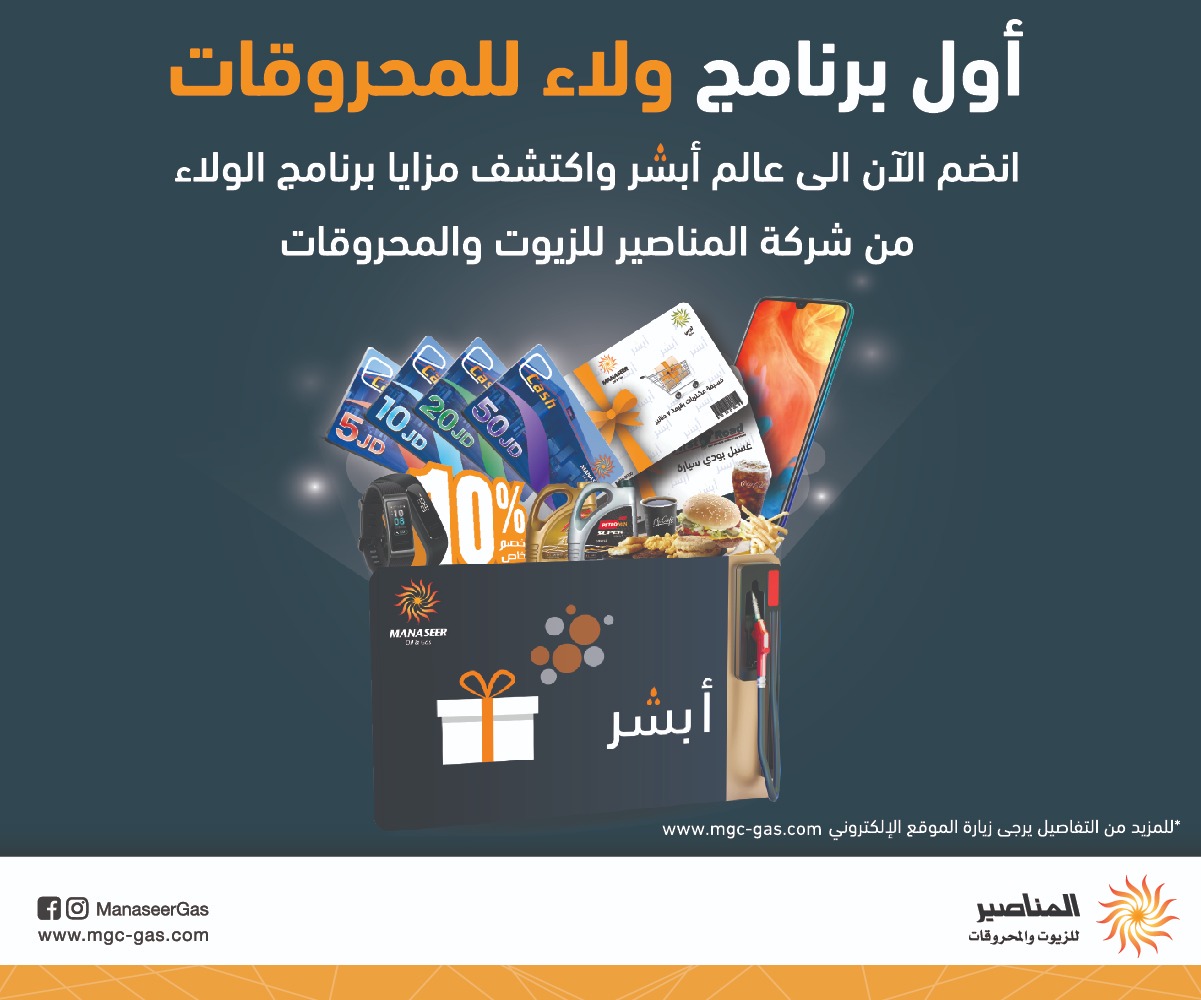 عمون - اطلقت شركة المناصير للزيوت والمحروقات أول برنامج مكافآت للمحروقات تحت إسم - أبشر- بحيث يتم مكافآة العملاء بالهدايا والعروض الخاصة نظير مشترياتهم من المحروقات داخل محطات المناصير وهذا البرنامج يعتبر الأول من نوعه في المملكة وأيضاً الأول على مستوى الشرق الاوسط في مجال المحروقات.