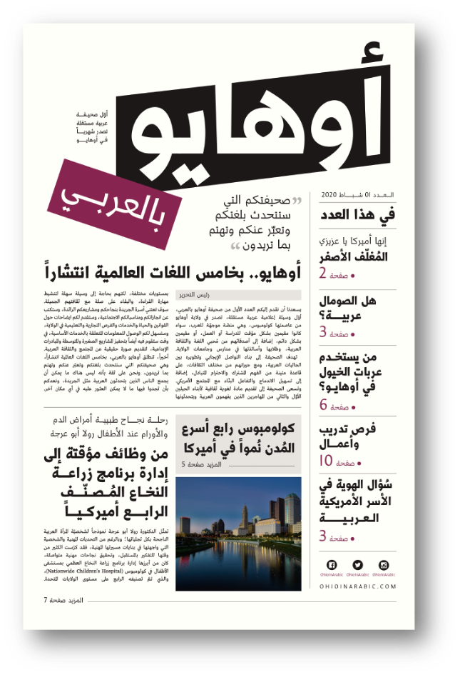 عمون - صدر اليوم العدد الأول من "أوهايو بالعربي"، أوّل صحيفة عربية مستقلة، تصدر شهرياً في ولاية أوهايو الأمريكية من عاصمتها كولومبوس، وهي منصّة موجهّة للعرب، سواء كانوا مقيمين بشكل مؤقت للدراسة أو العمل، أو مقيمين بشكل دائم، إضافة إلى أصدقائهم من مُحبي اللغة والثقافة العربية.
