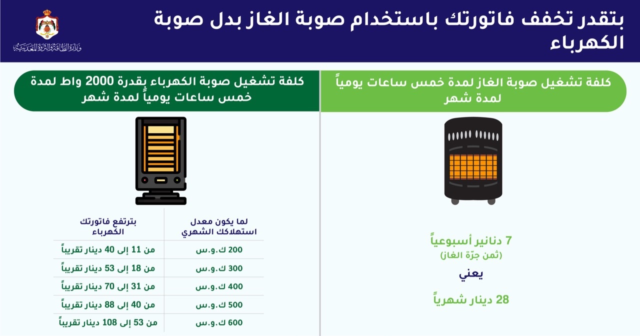 وبينت الوزارة أنه عندما يكون الاستهلاك الشهري 200 كيلو واط في الساعة ترتفع فاتورة الكهرباء من 11 الى 40 دينارا اذا استخدمت مدفأة الكهرباء بقدرة 2000 واط لمدة 5 ساعات يوميا.