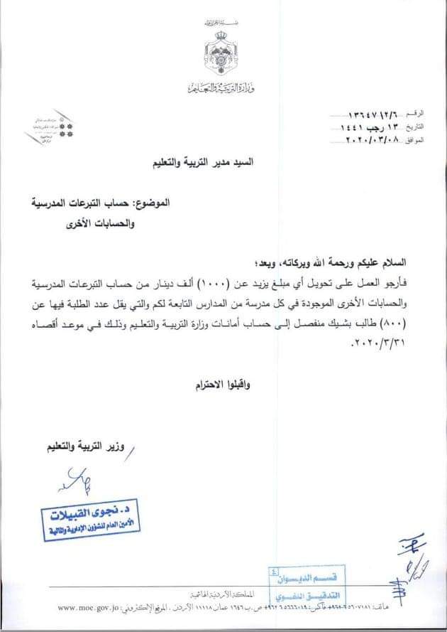 لست أدري كيف أخاطبك ، ولا أعلم ماذا اكتب إليك ،. لكن وفاء" للأمانة التي في أعناقنا وإخلاصًا لرسالة التربية والتعليم التي حملناها سنين طويلة أقول لك ، وبكل صراحة ووضوح دون لبس : إن قرارك بكتاب رقم 6/2/13647 وبتاريخ 8/3/2020 والمتعلق بسحب أرصدة ، المدارس، مهما اختبأت خلف أسباب ومبررات فإنه قتل للمدارس وتدمير عملية التعليم.