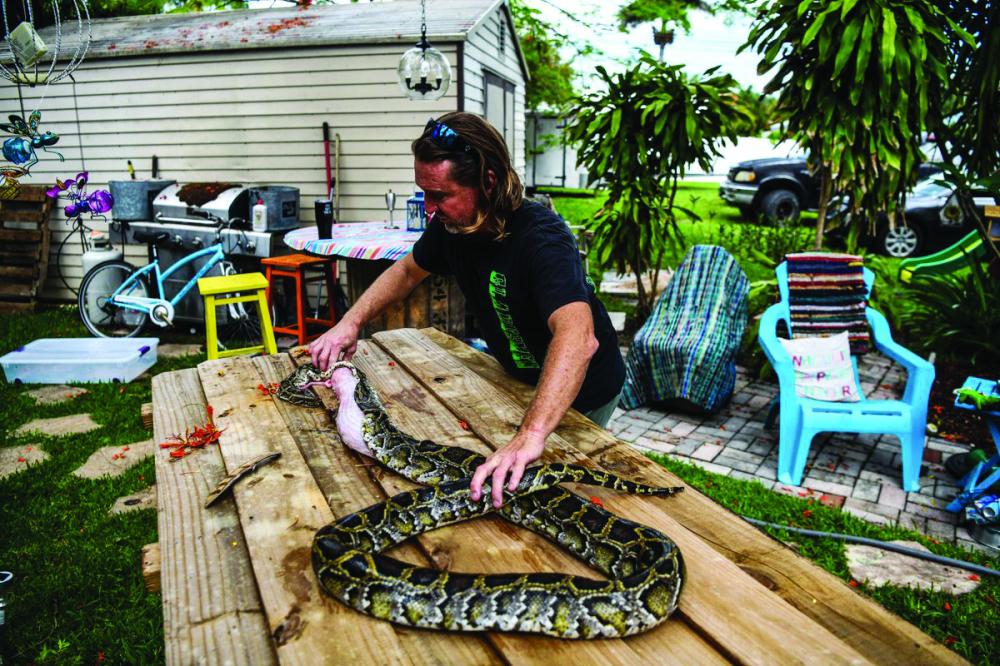 ويعتقد أن الثعابين أدخلت إلى فلوريدا كحيوانات أليفة في نهاية القرن الماضي وأطلقت في إيفرغليدز. ومن المحتمل أن أفاعي الإيغوانا الضخمة أدخلت إلى فلوريدا أيضاً كحيوانات أليفة قبل إطلاقها في البرية، حيث المناخ المعتدل يكون مواتياً لتكاثرها. وتدفع هيئة فلوريدا للأسماك والحياة البرية مكافأة للصيادين للإمساك بالثعابين.(أ ف ب)