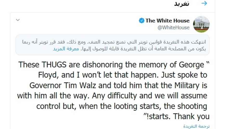 وكتب معلقا على اضطرابات منيابوليس: "هؤلاء الرعاع يشوهون ذكرى جورج فلويد ولن أسمح بحدوث ذلك. تحدثت للتو مع الحاكم تيم والز وأخبرته بأن الجيش معه قلبا وقالبا. سنسيطر على أي صعوبة لكن عندما يبدأ السلب والنهب يبدأ إطلاق الرصاص. شكرا لكم".