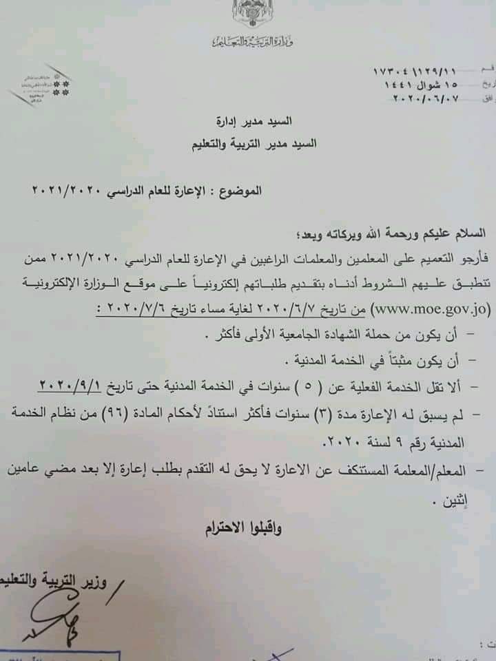 عمون - ينال المعاني - اعلنت وزارة التربية والتعليم عن فتح باب الاعارة للمعلمين والمعلمات الراغبين للعام الدراسي 2020/2021.