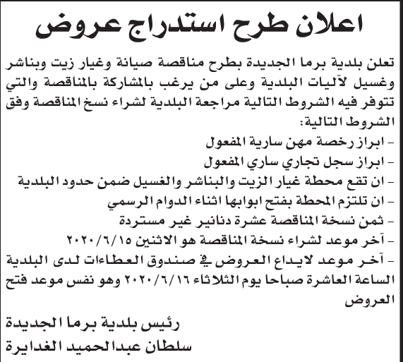 مطلوب استدراج عروض لصيانة وغيار زيت آليات بلدية برما