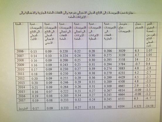 كما ينبأنا الجدول، أن متوسط نسب الانفاق الحكومي على التعويضات الى الناتج المحلي الاجمالي بالاسعار الثابتة بلغ 20% خلال الفترة 2006-2017 و 9% فقط من الناتج المحلي الاجمالي الاسمي.