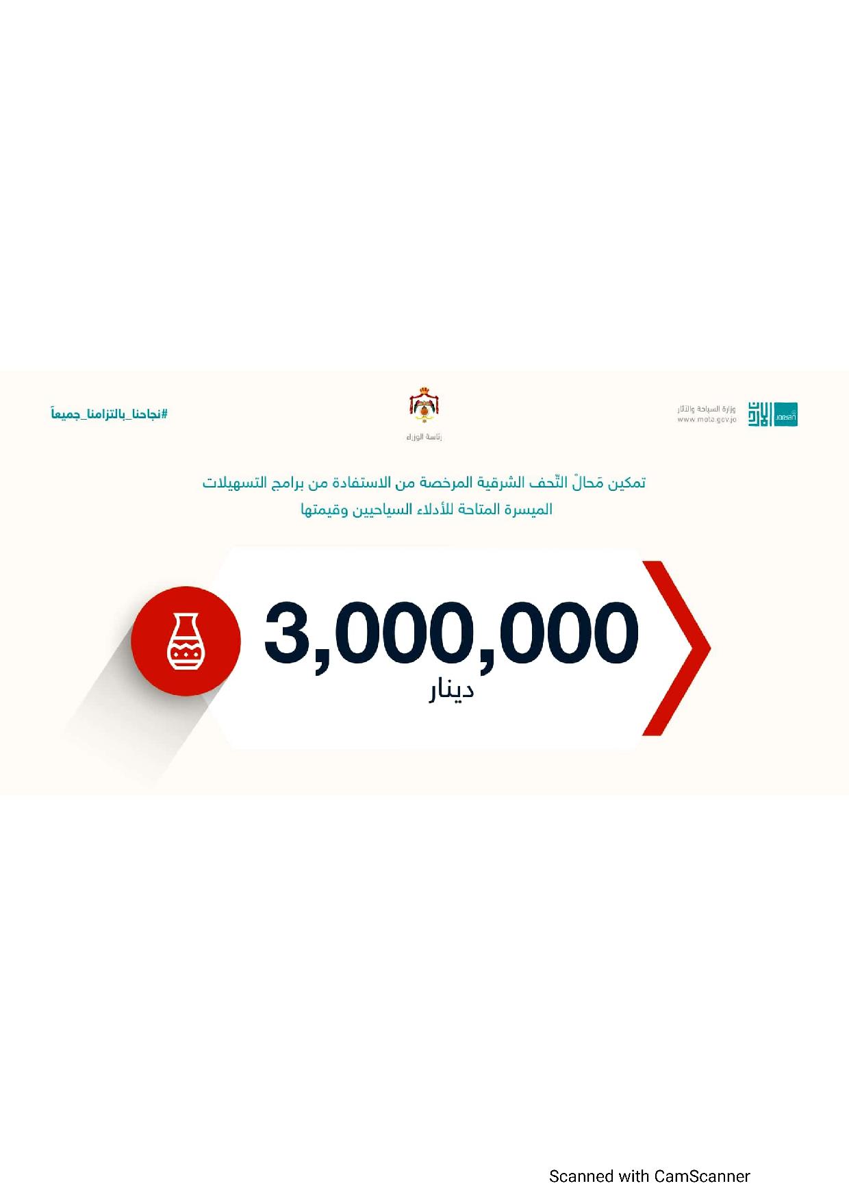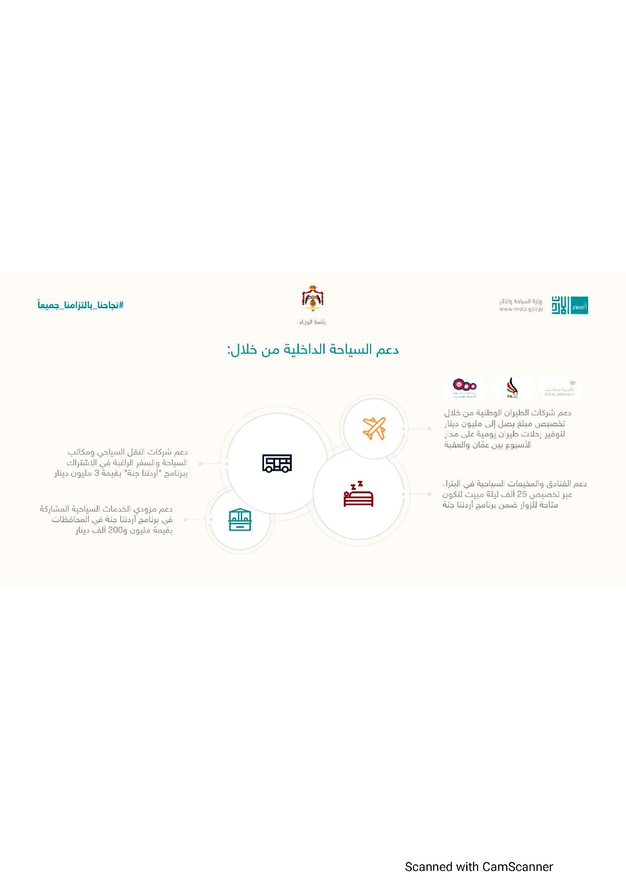 - دعم شركات النقل السياحي ومكاتب السياحة والسفر الراغبة في الاشتراك ببرنامج "أردننا جنة" بقيمة 3 مليون دينار/ لتوفير نقل سياحي مجاني لجميع وجهات البرنامج/ وحسب الآلية التي ستعلنها هيئة تنشيط السياحة خلال الأيام القادمة.