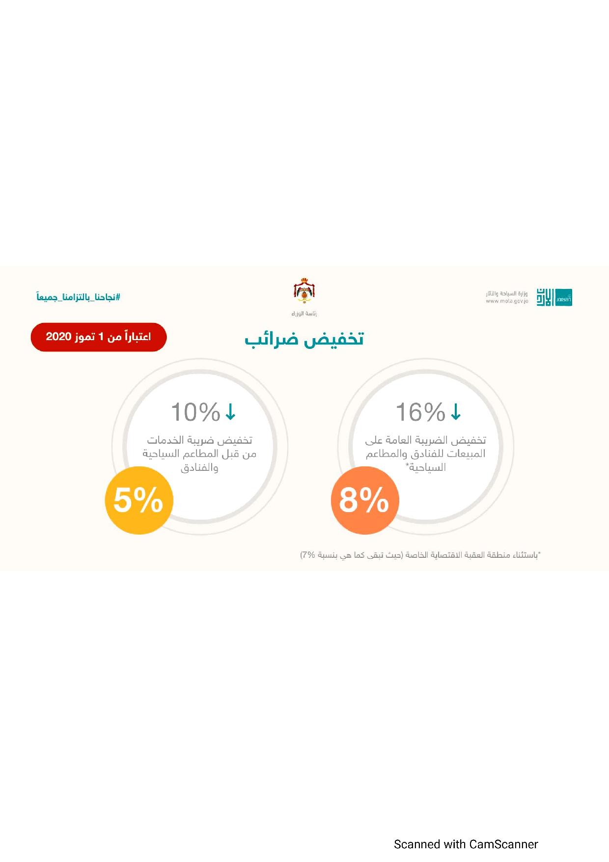 وتتضمن الاجراءات تخفيض ضريبة الخدمات من قبل المطاعم السياحية والفنادق لتصبح 5% بدلاً من 10%، وذلك اعتبارا من 1 تموز 2020.