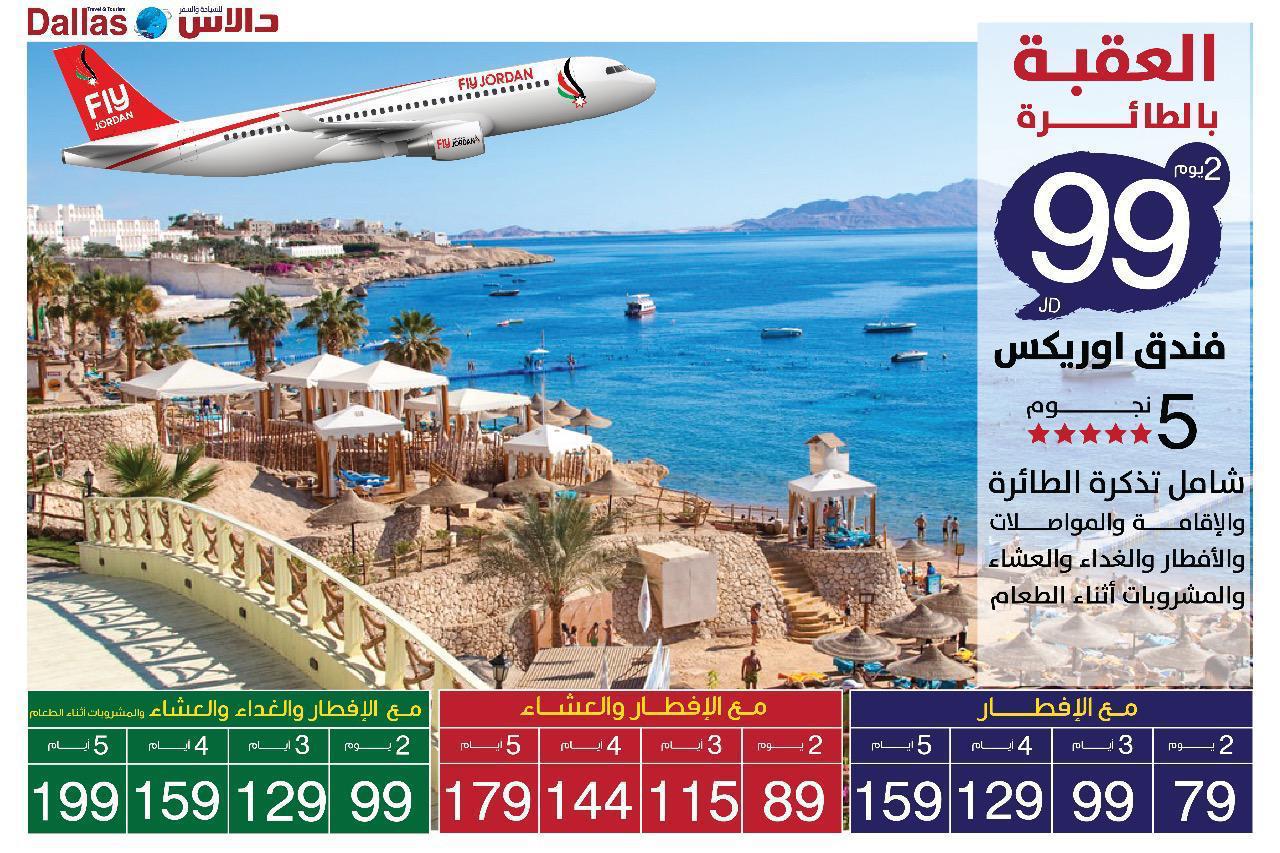 عمون - أعلنت شركة دالاس للسياحة والسفر عن عروضها السياحية إلى مدينة العقبة الأقتصادية الخاصة بالطائرة لمدة 3 ايام بـ 129 دينار شامله لجميع الوجبات والمشروبات أثناء الطعام والاقامة فندق أوريكس خمس نجوم وتذكرة الطائرة والمواصلات.