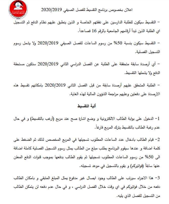 تفعيل تقسيط الرسوم الجامعية على دفعتين في الهاشمية24-06-2020 04:29 PM