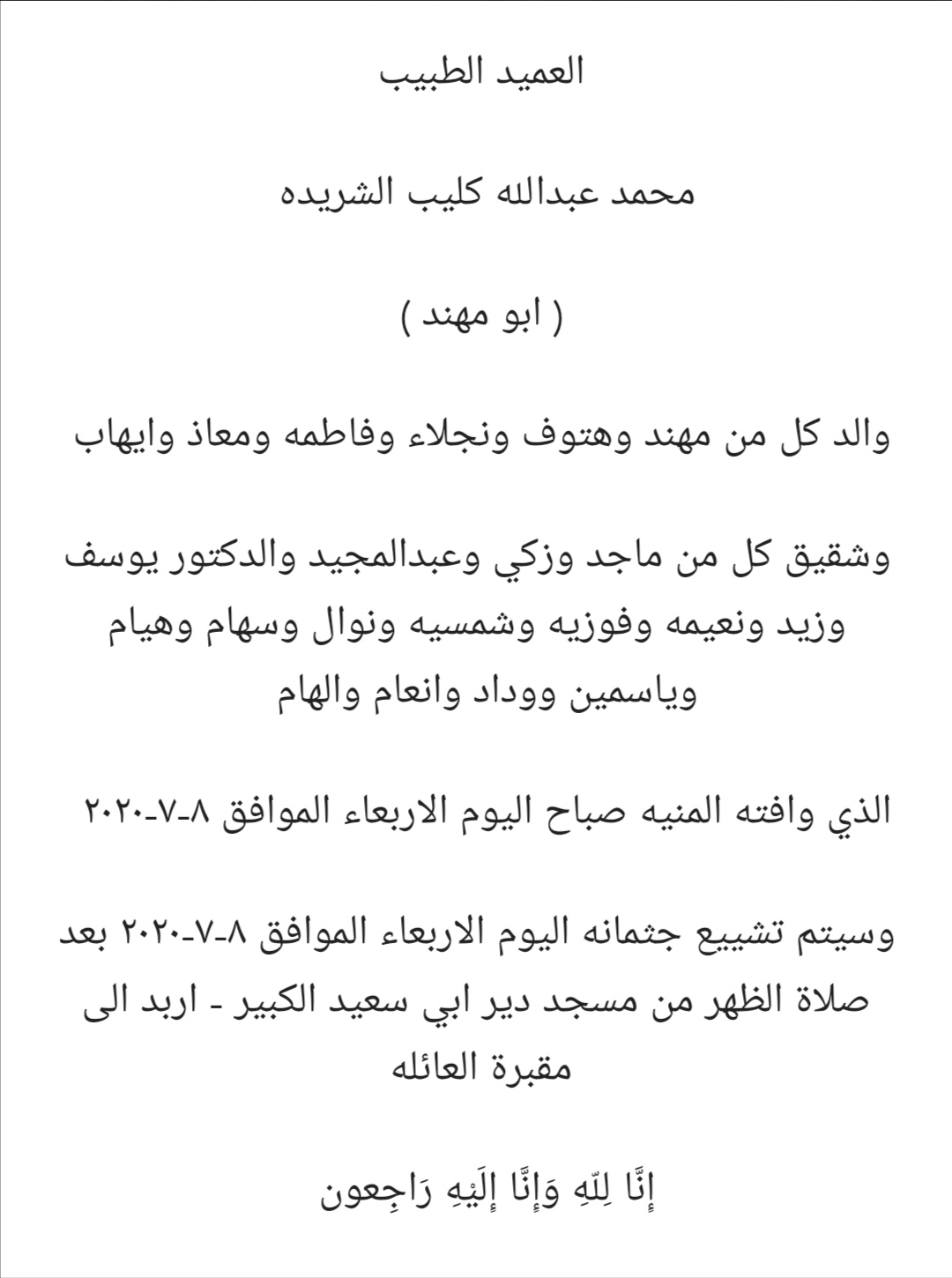 عمون - انتقل الى رحمة الله تعالى العميد الطبيب محمد عبدالله كليب الشريدة (ابو مهند)، الذي وافته المنية اليوم الاربعاء.