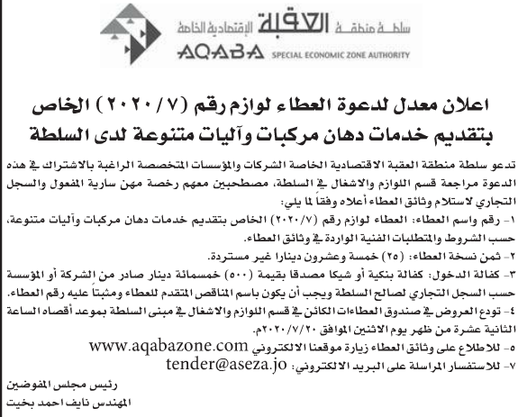 مطلوب تقديم خدمات الدهان لمركبات سلطة العقبة