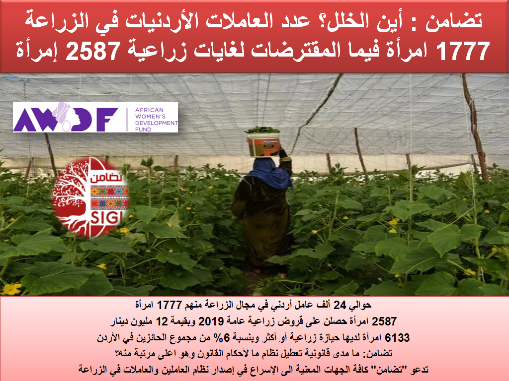 وتعتقد "تضامن" بأن هذه الأرقام الرسمية لا تعكس الأعداد الفعلية للعاملين والعاملات الأردنيين في الزراعة، خاصة وأن عدد الإناث اللاتي حصلن على قروض عام 2019 من مؤسسة الإقراض الزراعي لغايات زراعية يفوق أعداد العاملات في الزراعة، كما أن عدد الإناث اللاتي يملكن حيازات زراعية يفوق تلك الأعداد أيضاً. مع ملاحظة أنه من الممكن أن تكون أرقام العاملات في الزراعة تشمل من يعملن فقط ولا تشمل من يملكن مشاريع زراعية أو لديهن حيازات زراعية!