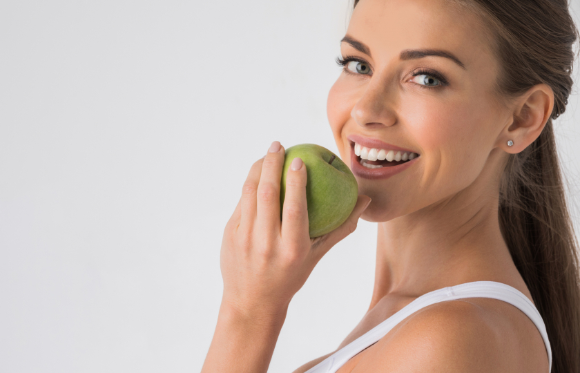 "إن حميةً غذائيةً متوازِنة بتركيزٍ على الفواكه والخضراوات، والبروتينات الخالصة من الدهون، ومصادر الكالسيوم بما فيها منتجات الألبان، والماء، لن تعزِّز صحتك فحسب، بل ستمنحك أيضاً ابتسامةً جميلة" – ليز بلوم، مدرِّبة التغذية والصحة لموقع The List الأمريكي.