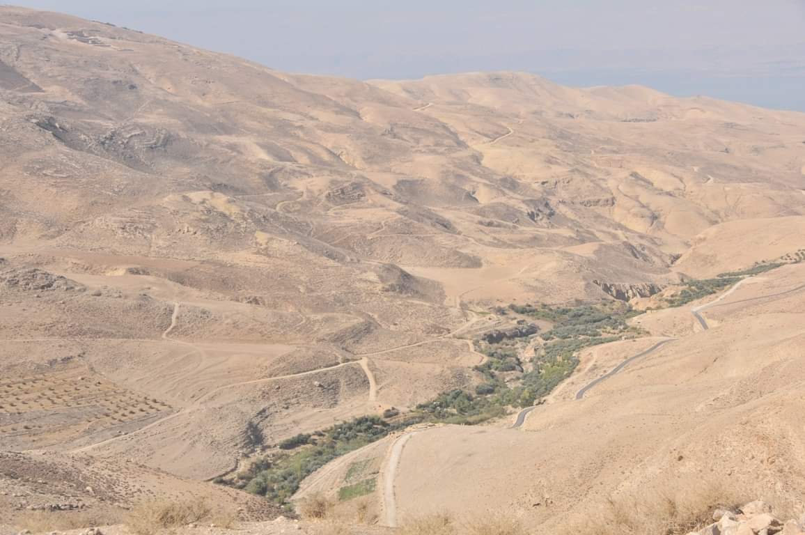 ابتدأ المسار بعد وجبة افطارٍ محلية من خبز الطابون وجبن ولبن الماعز البلديَ، تناولناها في حرش بلدة المخيط بالقرب من التل الأثريَ ذو الأثر البيزنطيَ وما فيه من جدارية فريدة من الفسيفساء، بقيت على حالها بكامل نقائها اللوني، تتناول حكاية المكان وما أنعم من خيرات وثمار وحيوانات عاشت في المنطقة كأنها وثيقة وصكٌّ تاريخيّ مقروء ممثلٌ برسوم، بُني عليها بيت سكنٍ في منتصف القرن الماضي، ما زال على حاله حامياً له ضمن محيط بين ثلاث كنائس أثرية؛ كنيسة القديس جورج، لوط..وكاسيو، ومن على التل الأثري أخذنا نظرتنا البنورامية للمكان، وللغرب منه يقع التوأم جبل نبو والطريق القديم إلى المغطس ونهر الأردن المقدّس، وفي الأفق جبال نابلس والقدس ومشارف أريحا ومقصد دربنا ونقطة النهاية حتى المساء.