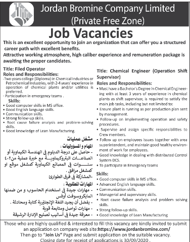 مطلوب موظف حاصل على دبلوم هندسية كيماوية للعمل لدى شركة البرومين