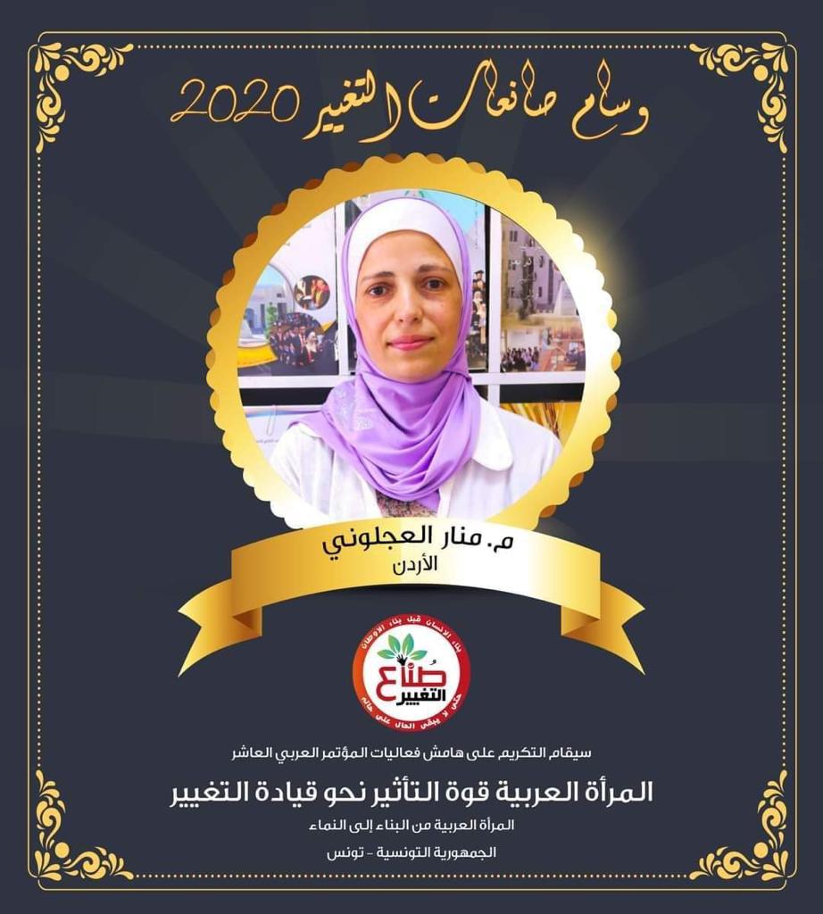 و ها هي الرائد منار العجلوني بفضل جهودها المتواصلة و عزيمتها و تصميمها لابراز دور المراة الاردنية ، سواء على الساحة الوطنية او العربية او الاسلامية او الدولية ، فقد فازت بوسام صانعات التغيير في العالم العربي ٢٠٢٠ .