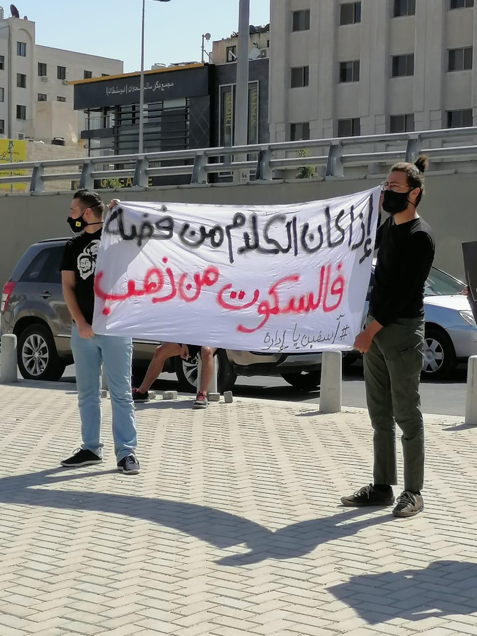 عمون - نظمت القوى الطلابية في الجامعة الأردنية (كتلة أهل الهمة، كتلة النشامى، كتلة العودة، كتلة الكرامة، كتلة التجديد العربية) اليوم الأحد فعالية ساخرة أمام البوابة الرئيسية بعنوان 'آسفين يا إدارة'، وذلك رفضًا لقمع الحريات الطلابية وممارسات إدارة الجامعة بتحويل الطلبة للجان التحقيق على خلفية منشورات على مواقع التواصل الاجتماعي، بالإضافة للضغط على الطلبة لنشر اعتذاراتهم على مواقع التواصل الاجتماعي. |