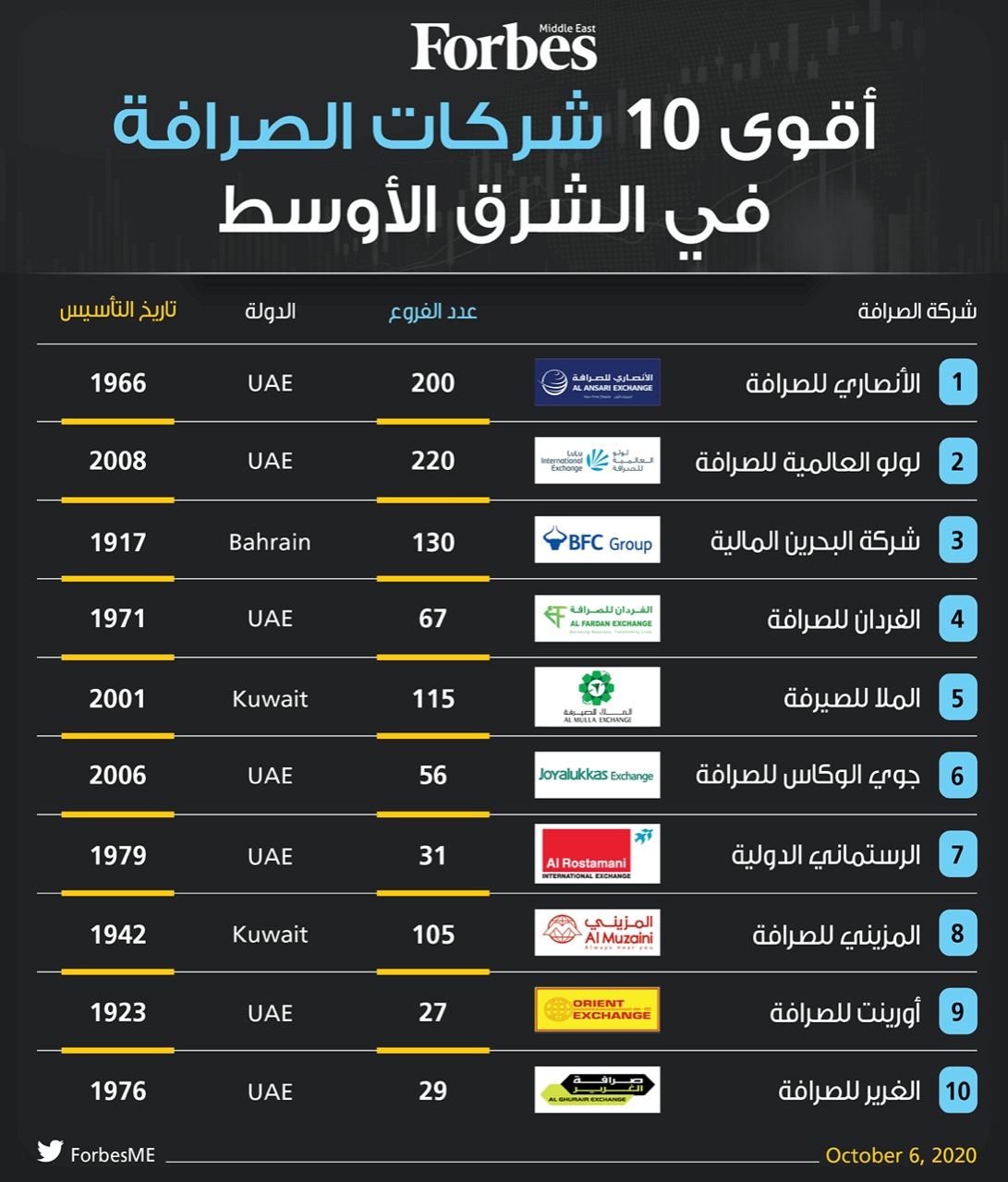تسلط فوربس الشرق الأوسط الضوء على أهم شركات الصرافة في المنطقة بتواجد 7 شركات من أصل عشرة من الإمارات العربية المتحدة.