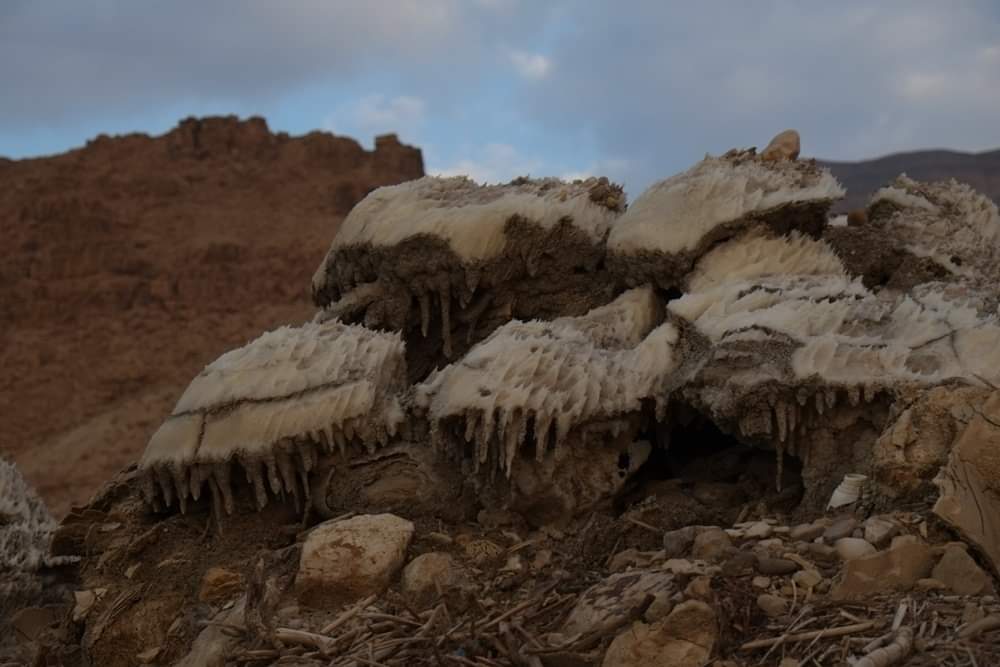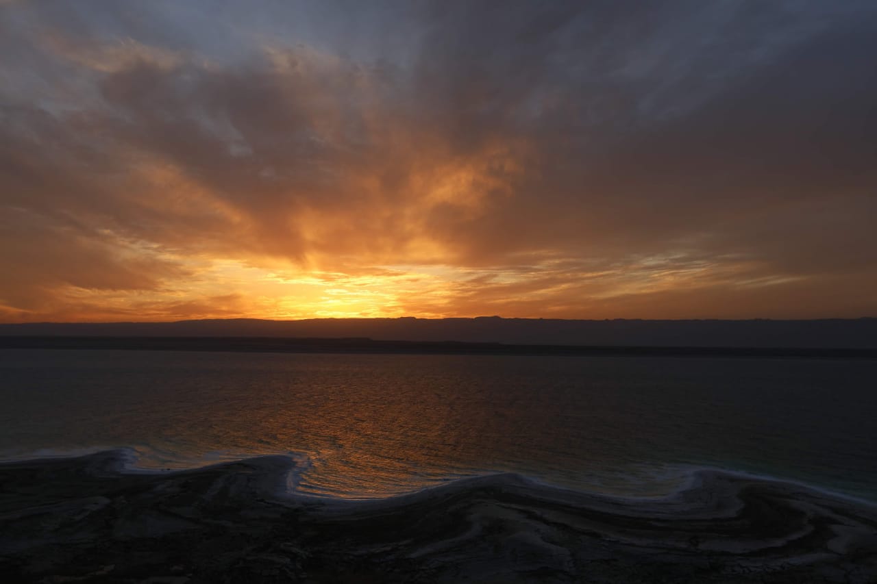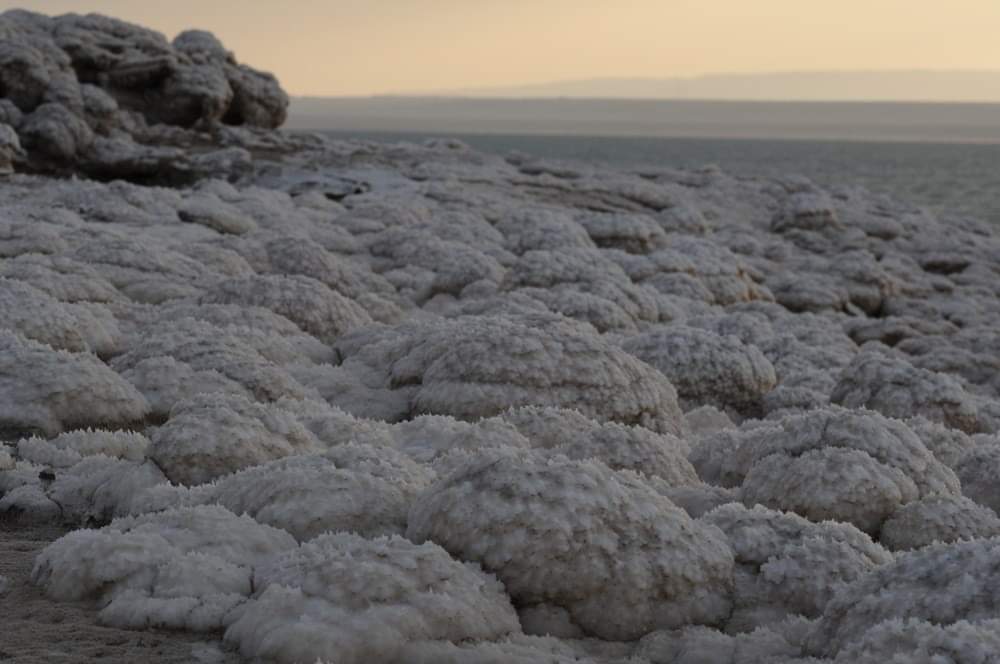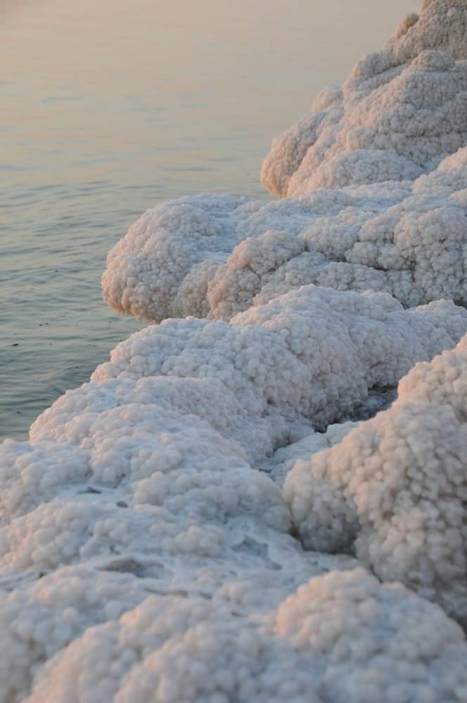 اخترنا أن يكون المسار هذه المرة مساراً استكشافيًا سهلاً للشاطئ، انطلاقاً من جنوبي مصب وادي الموجب، سرنا فوق أملاحه المتحجرة على طول المدى، مخالفين كل المسارات المعهودة بتكويناتها الجيولوجية؛ فهو المتفرد بهذا البياض اللامتناهي مع أفق الماء المتراكم بطبقاتٍ تعد سنواتها كأنها مؤشر للانحسار عام بعد آخر، بعد أن ضُخ من شريانه المقدس ليروي صحراء النقب مسحوب من مصب بحيرة طبريا تاركين كل ما يخصه لخطر الجفاف والموت التام.