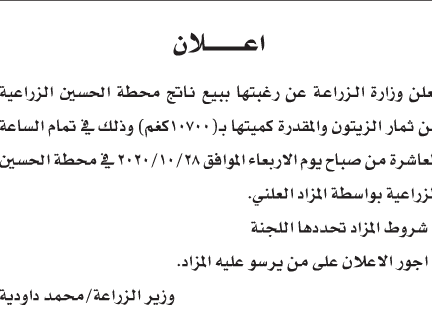 مطلوب بيع ناتج محطة الحسين الزراعية من ثمار الزيتون