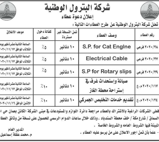عطاءات صادرة عن شركة البترول الوطنية
