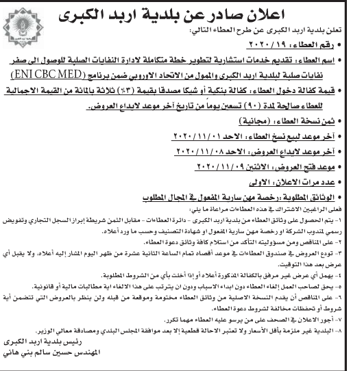 مطلوب تقديم خدمات استشارية لبلدية اربد الكبرى