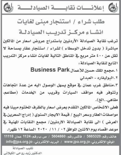 مطلوب استئجار مبنى لغايات انشاء مركز تدريب الصيادلة