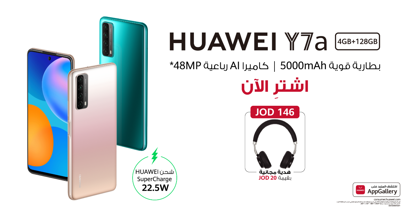 لا تتردد باقتناء هاتف Huawei Y7a الرائع اليوم بسعر 146 دينارًا عبر متجر هواوي Cell Avenue الإلكتروني من خلال الرابط: https://www.cellavenuestore.com/product/y7a/، أو من خلال زيارة أيّ من المتاجر التي تعرض منتجات هواوي، وستحصل على سماعة بلوتوث كهدية مجانية متوفرة بكميات محدودة.