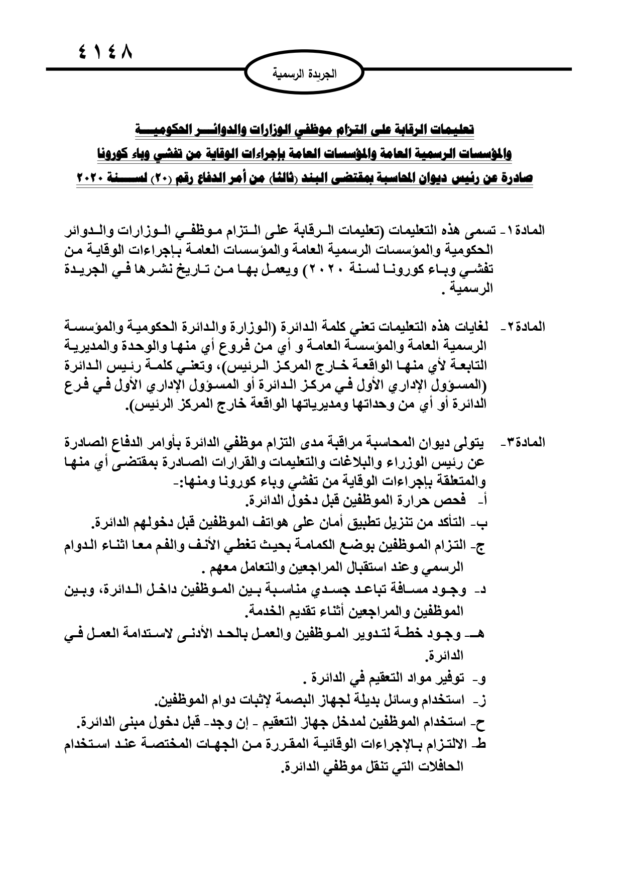 عمون - أعلن رئيس ديوان المحاسبة عاصم حداد، عن تعليمات الرقابة على التزام موظفي الوزارات والدوائــر الحكوميـــة والمؤسسات الرسمية العامة والمؤسسات العامة بإجراءات الوقاية من تفشي وباء كورونا، وفق عدد الجريدة الرسمية اليوم الاثنين.