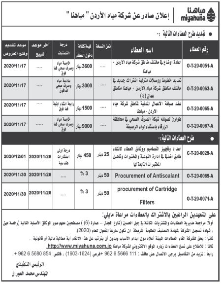 عطاءات صادرة عن شركة مياه الاردن" مياهنا"