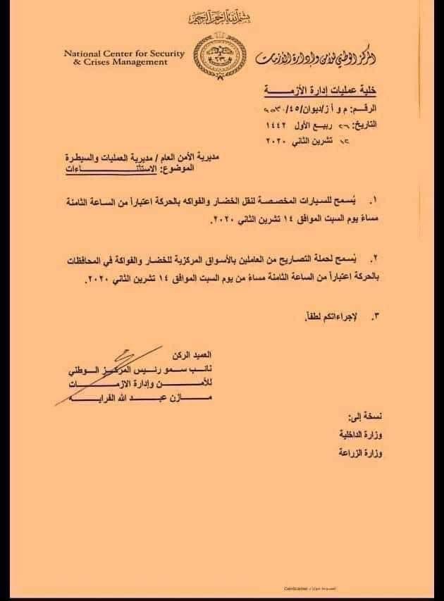 عمون- قرر المركز الوطني للأمن وإدارة الأزمات السماح للمركبات المخصصة لنقل الخضار والفواكه بالحركة اعتبارا من الساعة الثامنة مساء السبت القادم. |