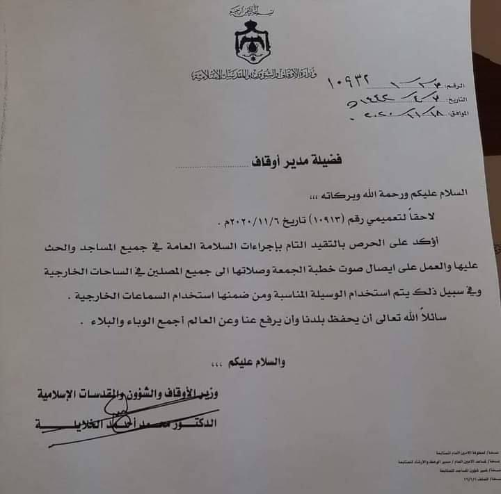 وفوض الخلايلة مؤذني المساجد بايصال صوت خطبة وصلاة الجمعة لكافة المصلين في الساحات الخارجية للمساجد باستخدام الوسيلة المناسبة ومن ضمنها السماعات الخارجية.