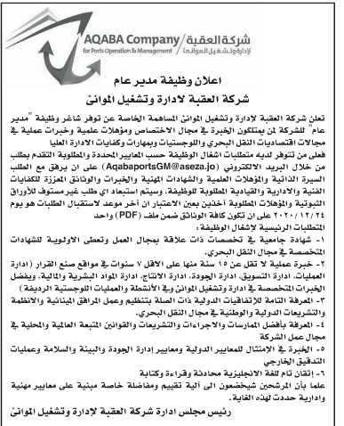 شركة العقبة لادارة وتشغيل الموانئ بحاجة لمدير عام