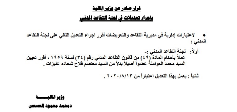 عمون - قرر وزير المالية الدكتور محمد العسعس تعيين محمد العواملة عضوا اصيلا في لجنة التقاعد المدني، بدلا من معتصم فلاح عنيزات.