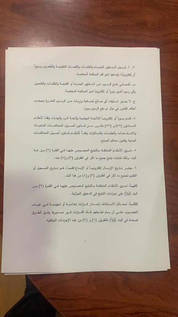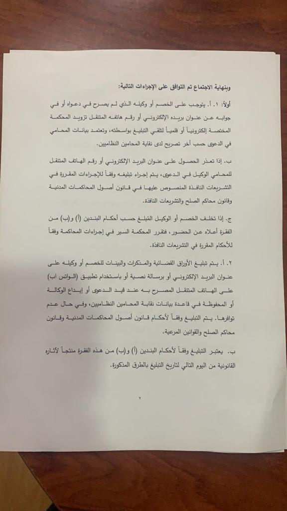2- أ. يتم تبليغ الأوراق القضائية والمذكرات والبينات للخصم أو وكيله على عنوان البريد الإلكتروني أو برسالة نصية أو باستخدام تطبيق واتساب على الهاتف المتنقل المصرح به عند قيد الدعوى أو إيداع الوكالة أو المحفوظة في قاعدة بيانات نقابة المحامين النظاميين، وفي حال عدم توافرها يتم التبليغ وفقا لأحكام قانون أصول المحاكمات المدنية وقانون محاكم الصلح والقوانين المرعية
