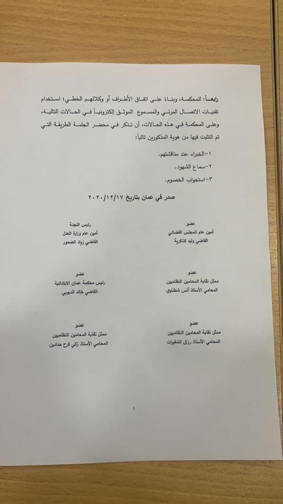 رابعاً: للمحكمة وبناء على اتفاق الأطراف أو وكلائهم الخطي، استخدام تقنيات الاتصال المرئي والمسموع الموثق إلكترونيا في الحالات التالية: الخبراء عند مناقشتهم/ سماع الشهود/ استجواب الخصوم